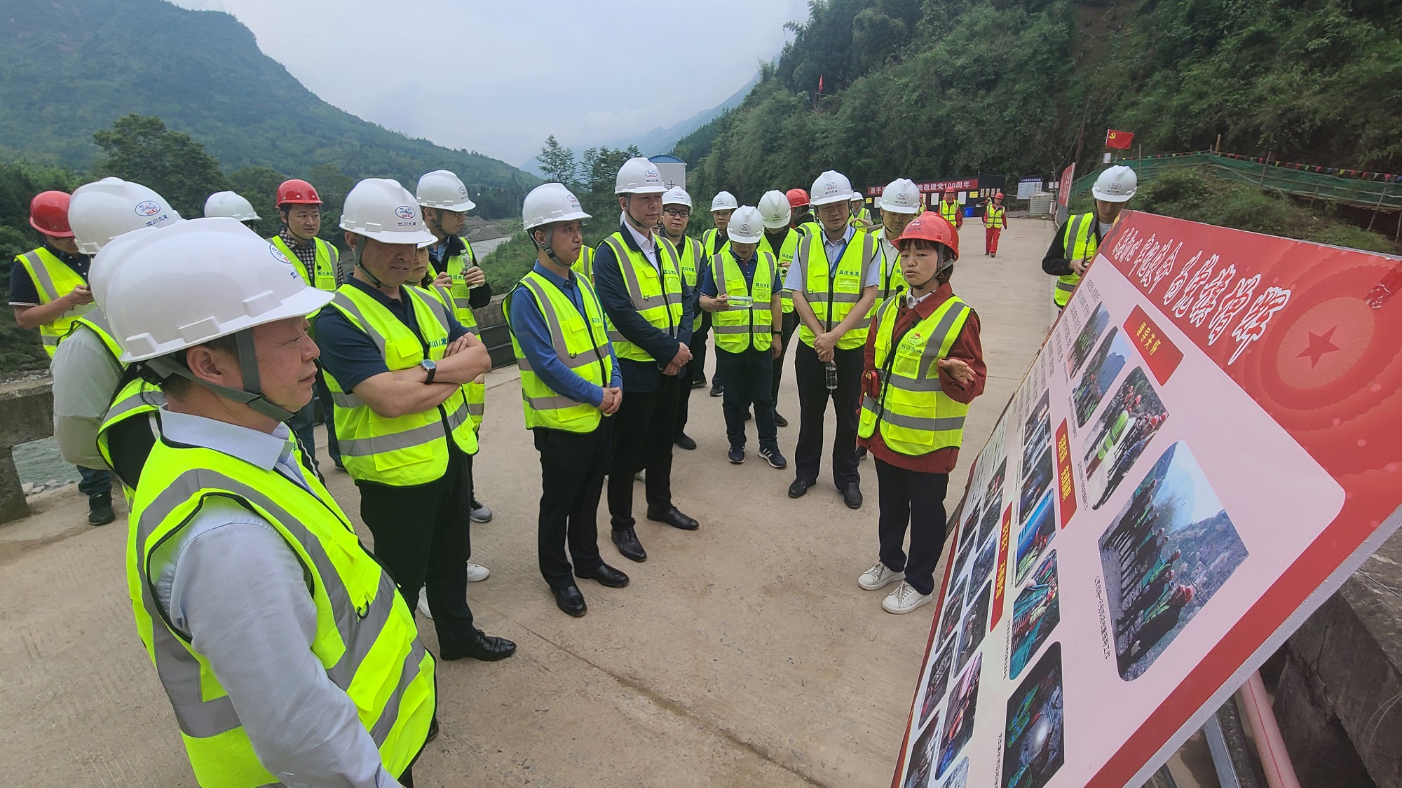 懷著昨日在瀘定緬懷革命先烈的激情,總部全體黨員干部歷經(jīng)3個半小時車程來到金雞峽壩址勘探平硐項目施工現(xiàn)場。下車之后,映入眼簾的是一座直沖云霄的大山、一片險象環(huán)生的懸崖峭壁。在工程局公司主要負責(zé)同志介紹項目概況后,項目部黨員同志以“初心不忘,使命召喚; 奮力拼搏,唯有圖強”為題,為大家上了一堂微黨課。微黨課重點反映了工程局公司堅持將黨建工作與項目建設(shè)深度融合所取得的成效,堅持“黨建融于項目中,黨旗立在工地上”,讓鮮紅的黨旗在施工一線高高飄揚;講述了施工建設(shè)中涌現(xiàn)的先進黨員代表事跡;講述了在70年代艱苦歲月工程局公司修建玉溪河引水大壩的感人故事;講述了在黨員干部的先鋒模范帶領(lǐng)下,全體干部職工發(fā)揚“不懼艱險、不畏疲勞、無私奉獻、勇挑重擔(dān)”的水利鐵軍精神,沿著既定目標(biāo),高效、安全地完成集團交給的任務(wù)。